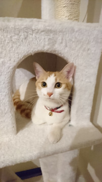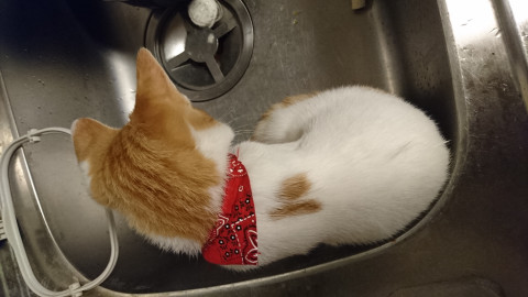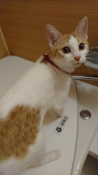 外れていなければ、鈴つきバンダナ型の赤い首輪をしています。