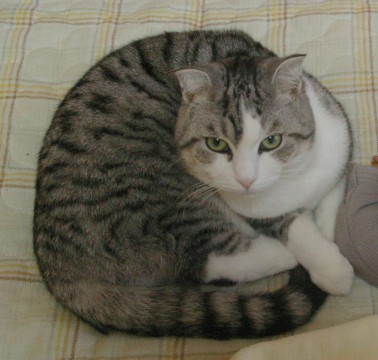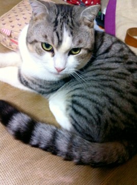 グレーっぽいトラ柄で、鼻回りからお腹にかけて真っ白。