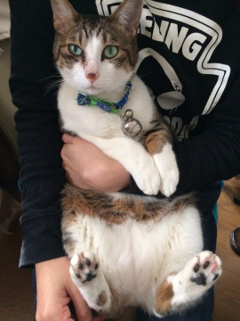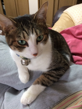 かわいい顔をしています。去勢しているのでおなかがたぷたぷです。緑と青の首輪をしています。大きな鈴もついています。