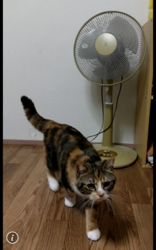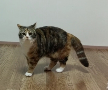 特徴:黒白茶の三毛猫、発情期中、足の毛が白い、人懐っこい、ぽっちゃり、首輪なし、マイクロチップあり