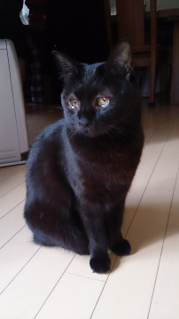 小さめの黒猫で、保護当時両目がくっついていたので両目をあける手術をしており、その手術痕が両目にあり眼球が少し引っ込んでいます。かぎしっぽです。