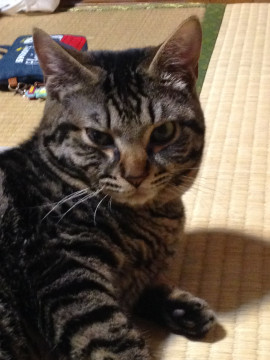 小太りで独り言を言います。縦ジマのカラフルな首輪をつけています。人なれしています。