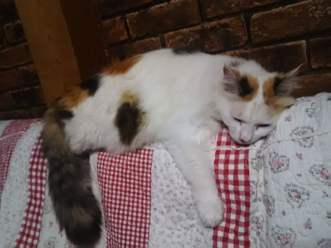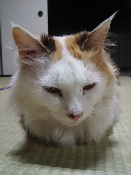 白い毛の面積が多い長毛の三毛猫の雑種です。