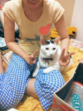 おでこに茶色の模様がふたつ、お尻の方に模様が集中しており尻尾は茶色のシマシマですが先っぽだけ白いです。「まぐたん」と高い声で呼ぶと返事をします。取れているかも知れませんが、大きな銀色の鈴のついた水色のバンダナが付いた首輪をしています。(3枚目の写真、白い方)
