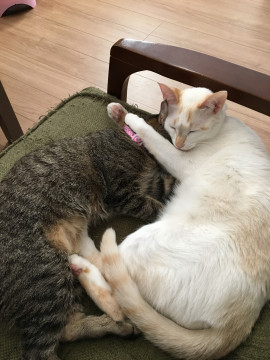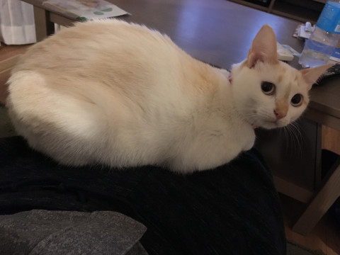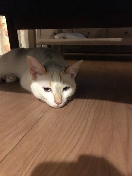 全体的に白くて背中、脚に薄い茶色が入っています。