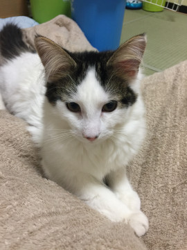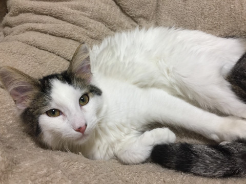 ノルウェージャンフォレストキャットのオスで頭とお尻に黒い毛があります。人懐こいですが警戒心も強いです。