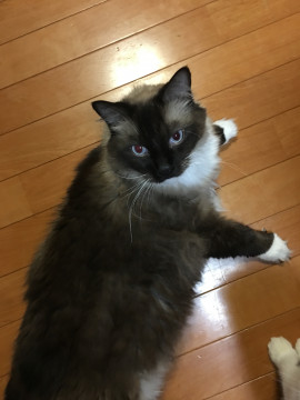 顔が黒くハート形になっています。片足が悪いので歩く時 片方だけ足音がします。