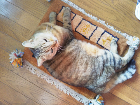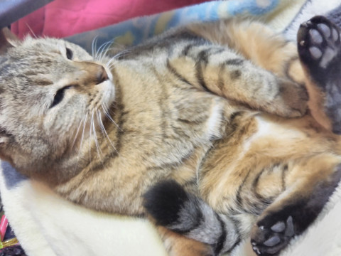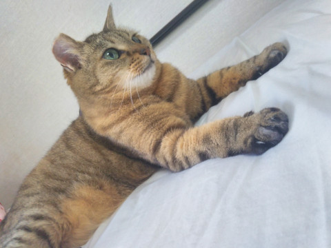 キジトラ。凍傷が原因で右耳の先がありません。左の前脚が休めをしているように外側を向きます。腰を怪我したことがあり、後ろ脚の動きが若干おかしく、高くジャンプすることはできません。とても人懐っこく、よく鳴きます。瞳は緑。後頭部の縦じま5本のうち、右から2番目が途切れています。