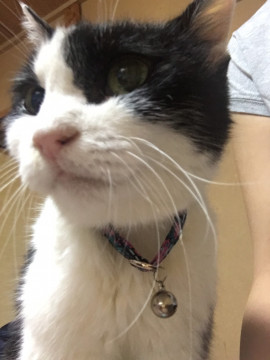 特徴は、老猫、黒白のハチワレ、細身、去勢済み、大きな声で鳴く、紺色に小花柄の首輪