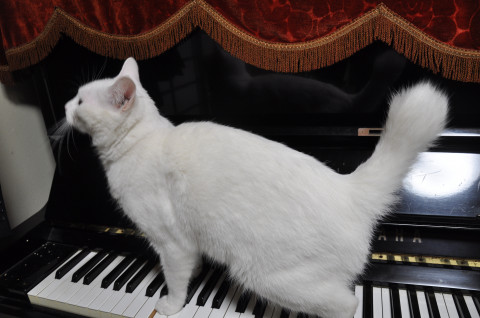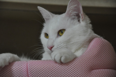 全身が真っ白です。触らないとわかりませんが、しっぽの先が釣り針状に5センチほど曲がっています。赤と青のストライプ模様の首輪をしています。首輪には鈴と赤いリボンが付いています。あまり鳴く方ではないですが、「くるみ」という名前を呼ぶと「ニャ」と返事を返してくれていました。