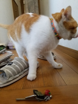 水色とオレンジ色と緑色のシマシマ模様の首輪をつけてます(とれている可能性あり)