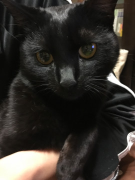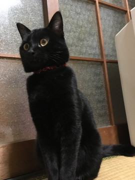 黒猫で耳と脇の毛が白くて、腰の左側に五円玉くらいの白い毛のかたまりがあります。ノミ取り用のピンク色の首輪をしています。