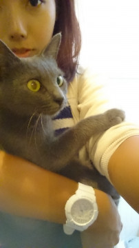 ロシアンブルーで青い首輪をしています。鈴がついているので歩く度に鳴ります