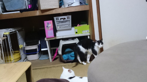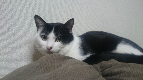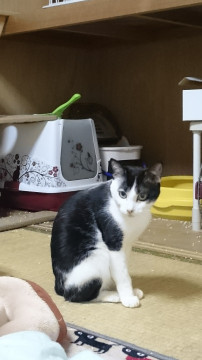 お腹側が白く、背中側が黒色で顔に八の字を書くように黒い模様があります。去勢済で人に対してはかなり警戒心が強いです。運動神経が良く、かなり素早い動きをするのと、人の動きをずっと観察しているので、良く目が合います。近づくとすぐにシャーッっと威嚇と唸り声をあげます。