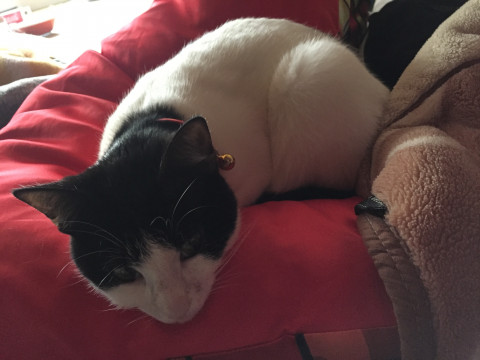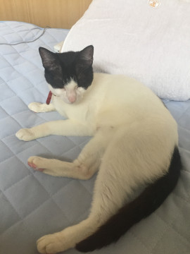 色は白と黒の模様で、赤い首輪をしています。
