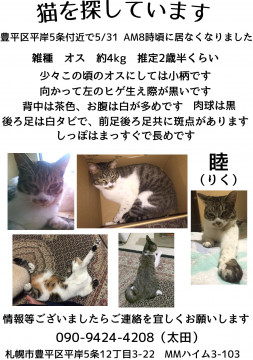 札幌市豊平区平岸5条付近で飼い猫の睦(りく♂去勢済)が5/31 朝8時過ぎに家を飛び出し、