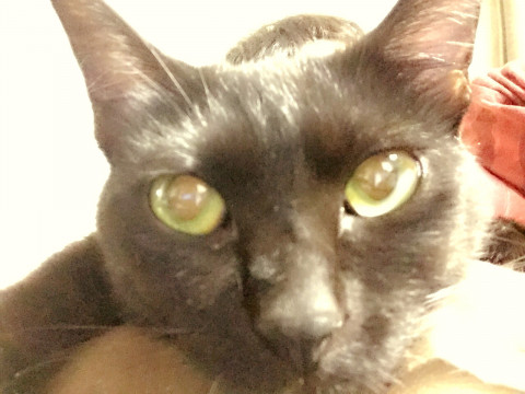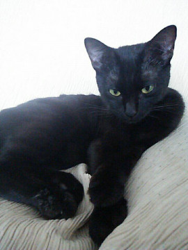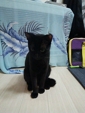 黒猫で小柄です、しっぽが曲がっており目はグリーン