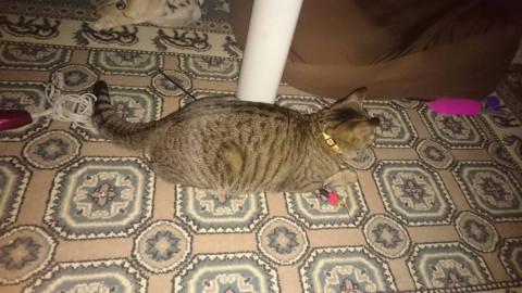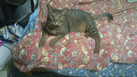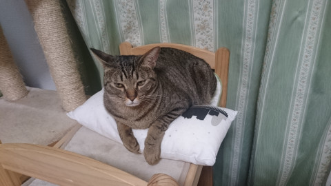 背中に3本しまのある人懐こいキジトラです。しっぽが太くて顔がまんまる。ントちゃん、と呼ぶと「にっ」と答えます。写真の黄色地にピンクのさくらんぼ模様の首輪をしています。弟猫と暮らしているので、猫にも慣れています。好きな食べ物はちゅーるのマグロ、金缶パウチです。怖いもの知らずで好奇心旺盛です。