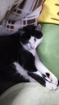 シロクロのハチワレで左目の上に麿眉毛みたいな模様があります。