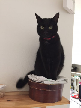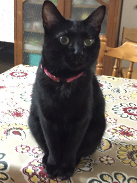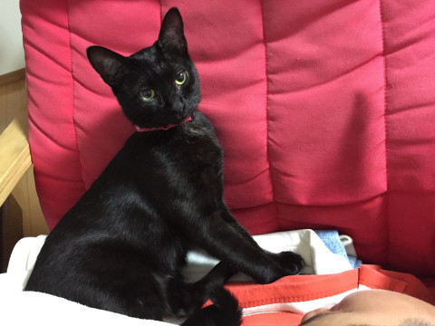 全身真っ黒の黒猫です。尻尾が長くピンと伸びています。ピンクに白水玉の首輪(セーフティタイプで外れているかも)成猫ですが小さめです。