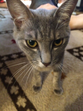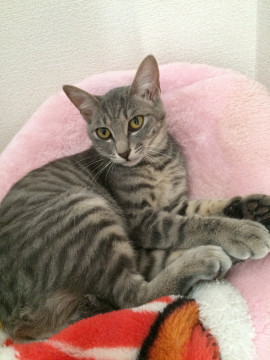 小さめで、尻尾は15cmくらいの長さで、グレーです。首輪はつけてません。
