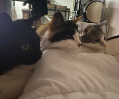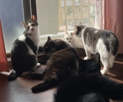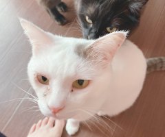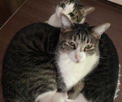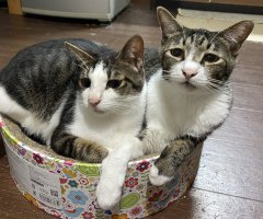 ペット可のマンション在住、結婚しました。 白サバ(♂)のキラとサバ白(♀)のレナの兄妹にゃんこの里親になりました。その後素敵なご縁の元、ハチワレミケ(♀)のモモと黒猫のケイの兄妹にゃんこの里親になり...