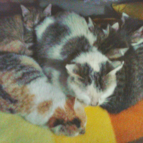 親子猫を保護し、4匹の子猫を譲渡、母猫と子1匹をウチで飼っています。