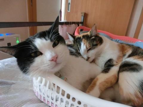 おっとりマザコン白黒ハチワレ♂の大福と やんちゃなミケにゃんあんみつとっても仲良しです