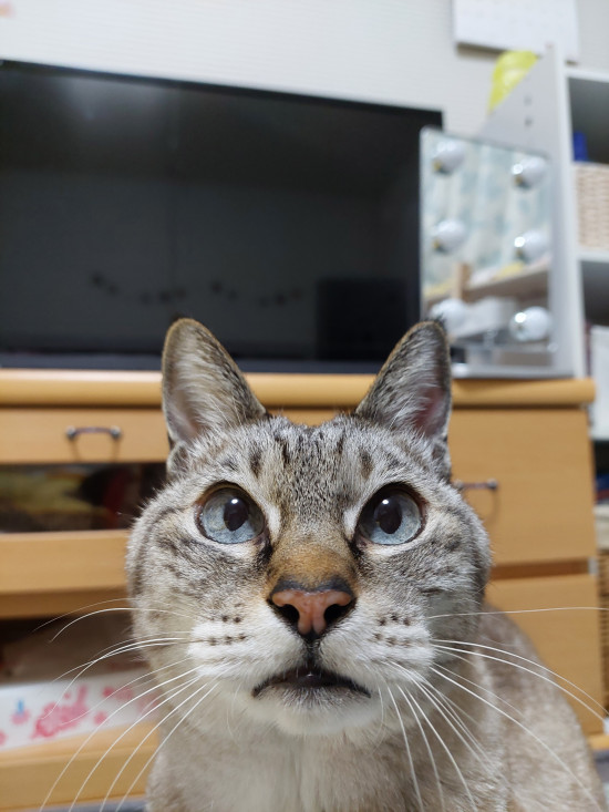 今飼っている16歳になるキジトラの女の子です 目がブルーでとても元気な猫です