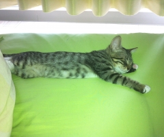 5/28 初めての動物病院での診察でワクチン接種と瞬膜が露出していつも眼が半開きだったのでこちらも治療してもらおうとお願いしましたが、抗生物質入りの目薬を使用するため、ワクチンは後日となりました。