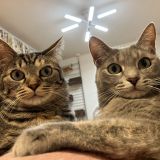 ネコジルシでご縁があり、女の子の姉妹を迎えました キジトラのさららと、グレーキジのうるるです(*・ω・ノノ゙☆ 茶トラの三太郎(サンタ)が居候中?